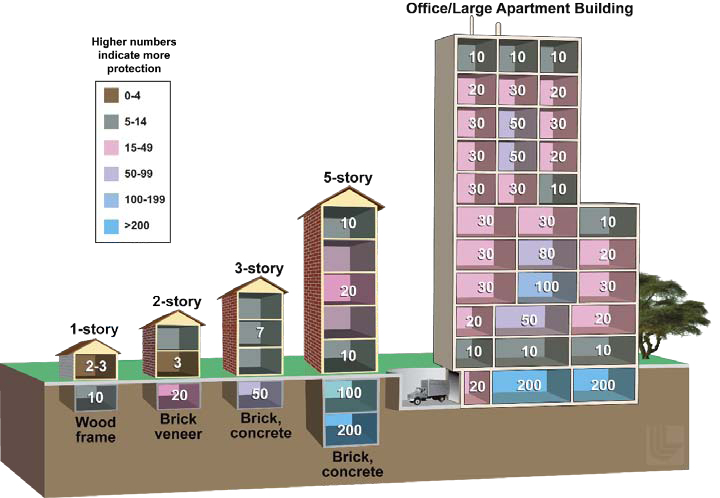 One way to minimize that total exposure is to get to a location that blocks more radiation. The best shelter is belowground — say, in a basement. Hiding in the basement of a large apartment or office building can bring radiation levels down to one two-hundredth of the outdoor dose, a protection factor of 200. Being inside a one-story wooden house, on the other hand, may only cut your exposure in half, a protection factor of 2. About 20 percent of U.S. houses are considered poor radiation shelters (we’re looking at you, California wood-frame cottages without basements).