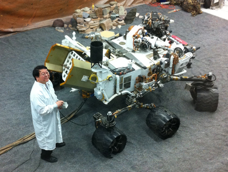 In another building on the JPL campus, a mock Curiosity rover is trundling around atop a seeming paradox: clean dirt, a grayish substance that serves as a stand-in for Mars’ red sands. “It’s actually crystals. Small, crushed crystals,” says Eric Aguilar, systems integration and tech manager for the Mars Science Laboratory. “It doesn’t cause as much dust.”