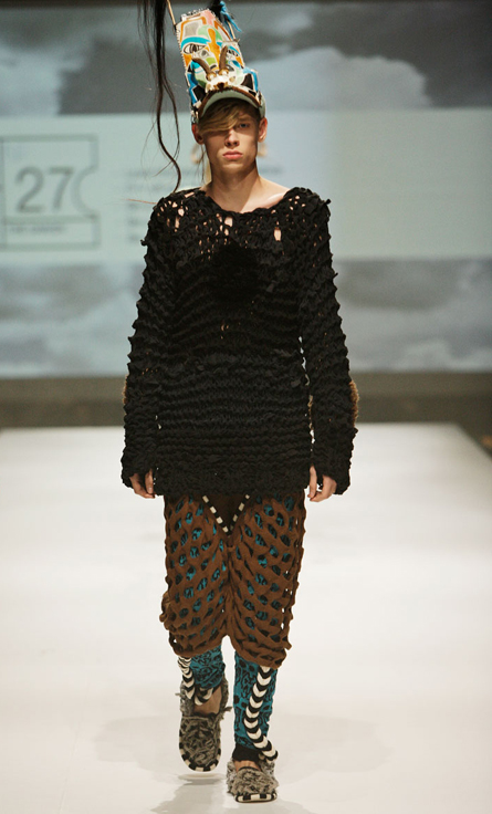 Pieces are also sort of unisexual, eliminating the need for having separate men’s and women’s departments in a store. One rack serves all, although the designers emphasize that their goal is not to dress men and women identically. In fact, each piece would have self-tailoring elements. By snapping, zipping, pulling draw strings or layering pieces differently, each gender could get its own look. Once again, the idea showed imagination and possibilities. By contrast, the actual execution was almost boring. There was what looked like a jacquard navy-blue cape over a light teal shirt. Tight cream and blue knit pants – they could almost be leggings – completed the ensemble. At least the fabric here looked substantial and comfortable.