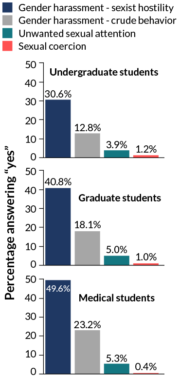 Most of the time, that abuse of power is not sexual coercion or unwanted sexual attention, as the report points out. Instead, it’s sexist hostility and crude behavior creating an unfriendly environment. In a 2015 survey of the Penn State University system, almost 31 percent of undergrads, 41 percent of graduate students and 50 percent of medical students reported experiencing sexist hostility from faculty and staff — nasty jokes or comments about how women aren’t smart enough to succeed, for example. Between 13 and 23 percent of women reported crude behavior (such as sexist insults). Each instance may seem relatively minor, but together they contribute to an environment where women feel devalued and unwelcome, the report concludes.