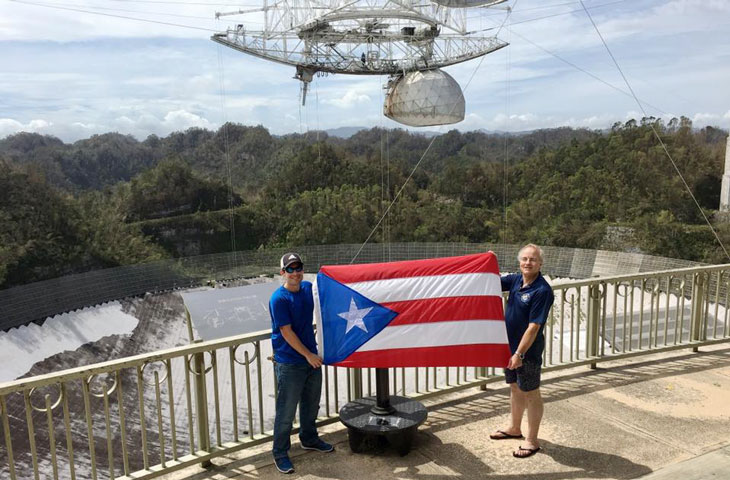 On September 23, observatory director Francisco Córdova posted a picture to the observatory’s Facebook page of two staff members standing in front of the big telescope dish with an outstretched Puerto Rican flag. “Still standing after #HurricaneMaria!” the post declares. “We suffered some damages, but nothing that can’t be repaired or replaced!”