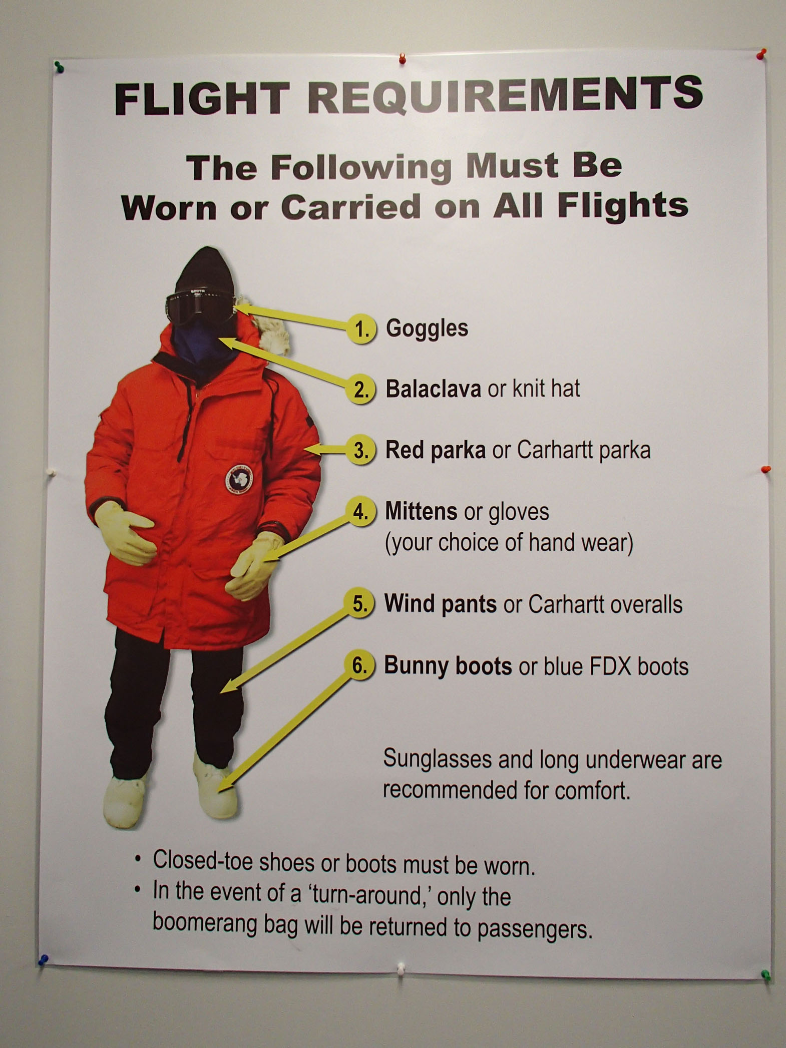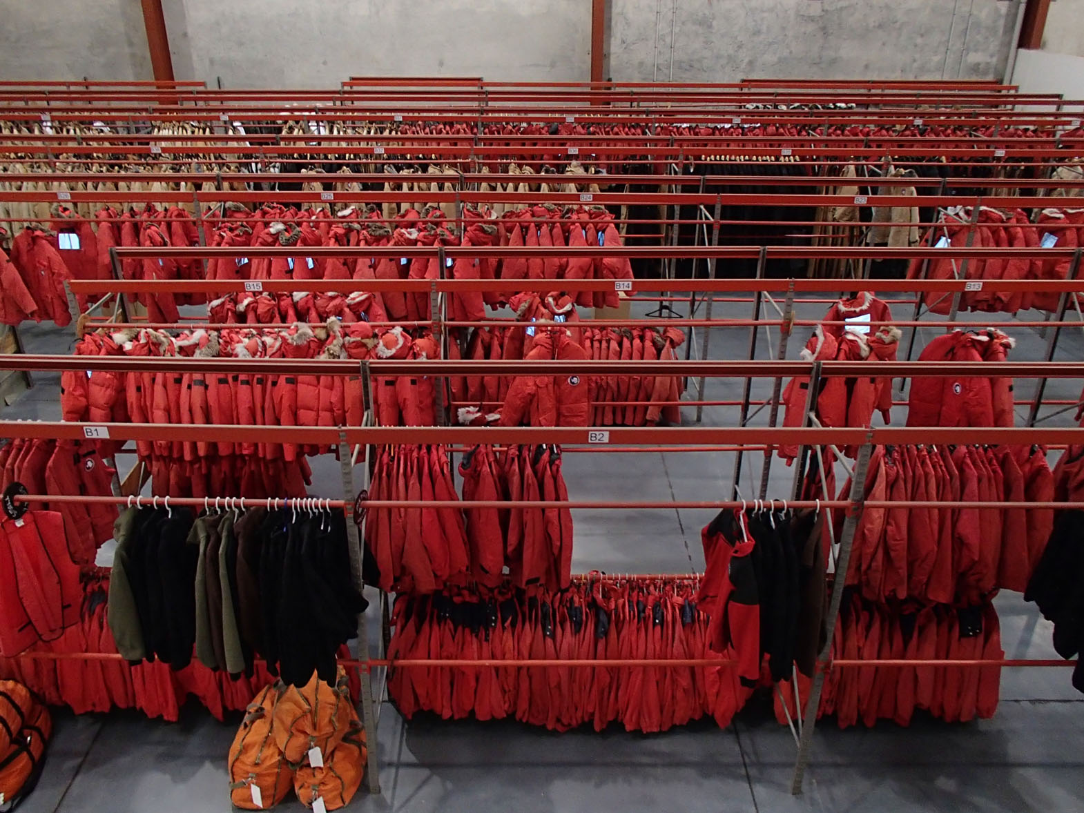 This cold can really bite at your ears, nose and toes. So to protect us, the U.S. Antarctic Program loans visitors a heavy red parka, snow pants, huge superinsulated boots and neck warmers. They issue the gear at a facility across the street from the airport in Christchurch, New Zealand — the staging site for most Americans en route to the continent.