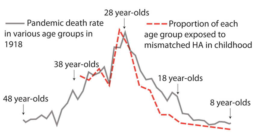 The 1918 death rate of various age groups from the pandemic flu virus is shown in solid gray. The dashed red line shows mismatched hemagglutinin flu antigens (HA) during childhood.