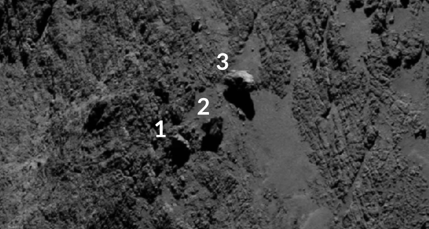 Three boulders (shown) balance precariously on comet 67P/Churyumov-Gerasimenko in this Sept. 16 image taken 29 kilometers above the surface by the Rosetta spacecraft