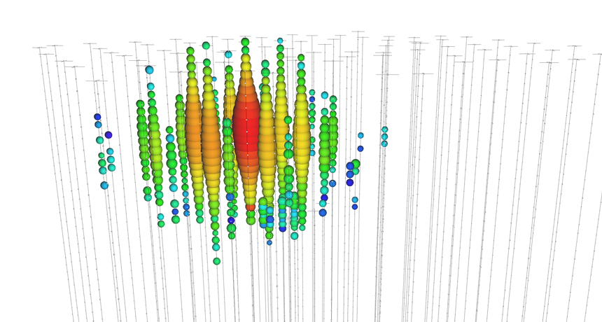 This figure illustrates the detection of the record-setting high-energy neutrino named Big Bird. The red region represents the initial flash of light triggered by the neutrino.