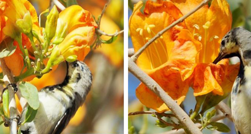 Purple sunbirds rarely consume the nectar of a desert teak flower through its opening (right), preferring to rob the flowers by piercing through the base (left).