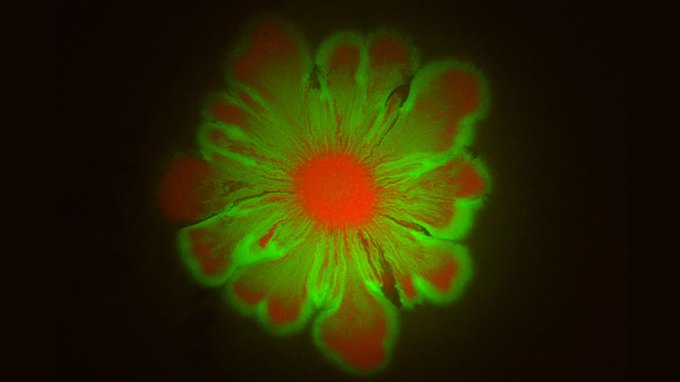 Different types of microbes growing in lab dishes can push each other to make floral patterns.
